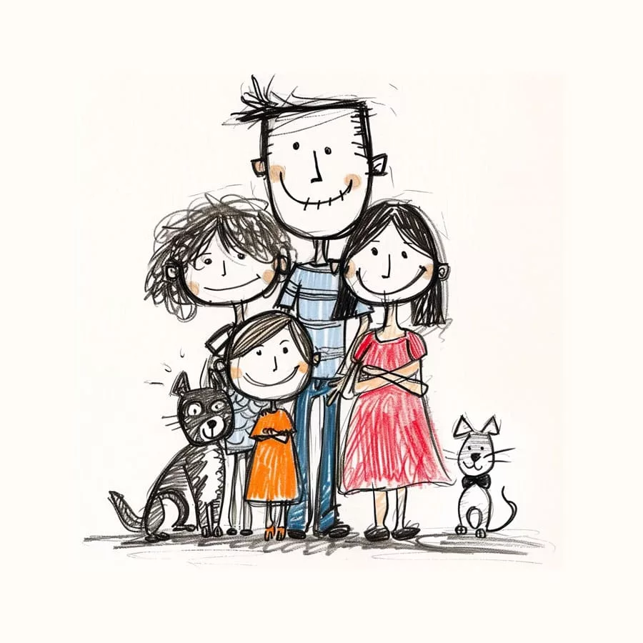 Imagine where this happy family is. Are they at home, in a park, or maybe in a special place for them? Draw and color some elements that you think belong in their story, like toys, a rug, or trees and flowers if they are outdoors.