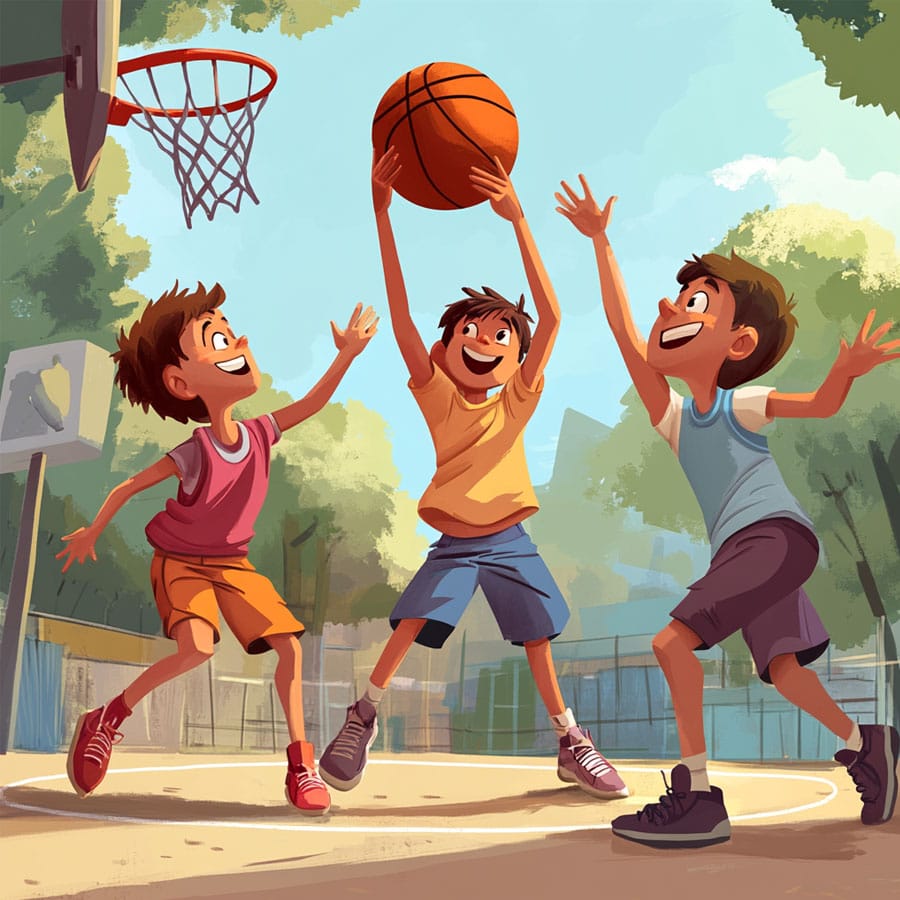 “The children are wearing sports uniforms so you can use vibrant colors like blue, red, green, or yellow for their shirts and shorts. Add shadows with darker colored pencils to give depth. Their shoes can match the uniform or have eye-catching details. For the basketball, use an orange tone with well-defined black lines. If you want to give it texture, add small dots or soft shading with a brown pencil.