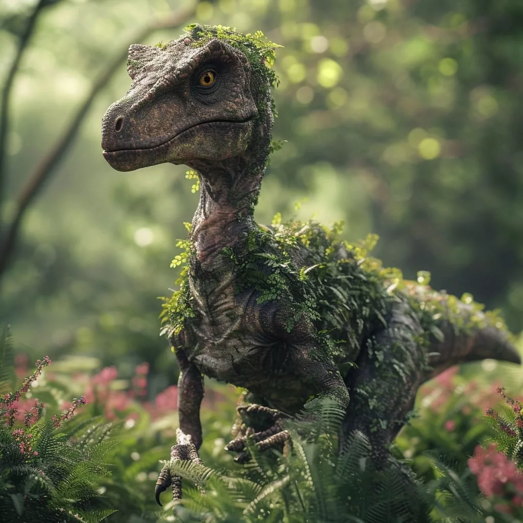 To create depth in the landscape, apply the chromatic perspective technique: background elements should be colored with more muted and less saturated tones, while elements close to the velociraptor maintain vibrant and intense colors. Giant ferns can benefit from the “pointillism” technique: small dots of different greens that, viewed together, create complex and natural textures.