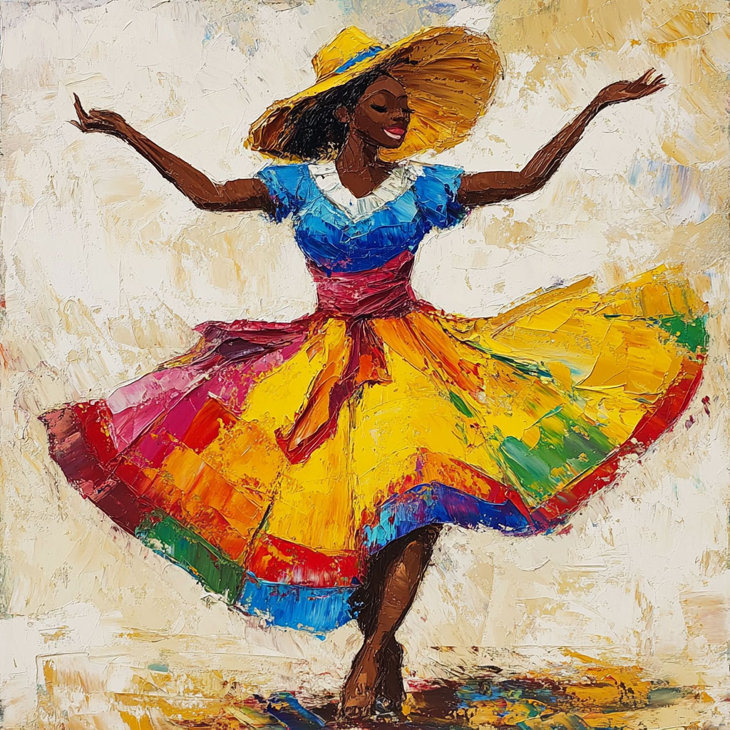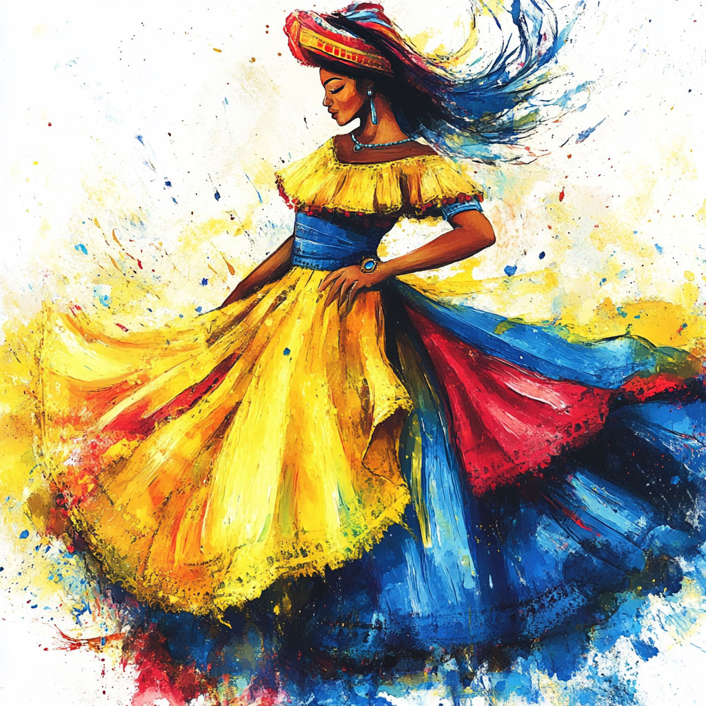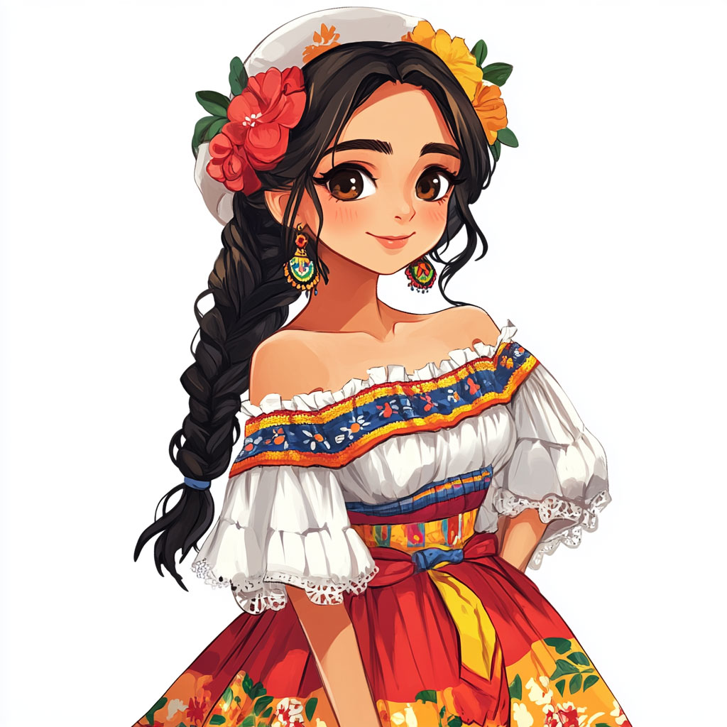 For the dress, use vibrant colors like red, blue, or yellow, as these tones are common in traditional attire in many Latin American countries. You can add white or gold details to highlight the embroidery and adornments. The ruffles and lace can be in contrasting or lighter colors to give an effect of movement and lightness.