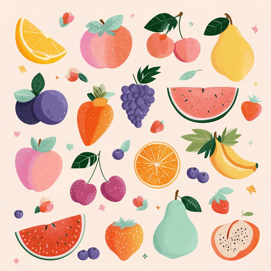 The expression of the fruits is key: a smile, round eyes, subtle details on the cheeks. Here you can explore how color enhances emotion. A child might choose warm tones for the cheeks to make the oranges look happier or even add creative details like glasses, eyebrows, or backgrounds with sky and grass.