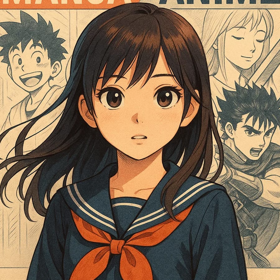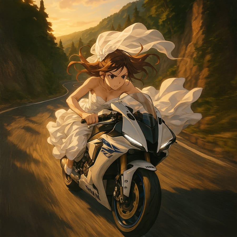 This illustration falls somewhere between shōnen and shōjo manga, blending dynamic motion with emotional and visual softness. The motorcycle is highly detailed, full of mechanical precision, while the girl’s large eyes, expressive face, and flowing lines of the dress add a dreamy, romantic vibe. The speed lines on the ground and the swirling fabric create a sense of high-speed movement, almost like we’re watching an anime scene in motion.