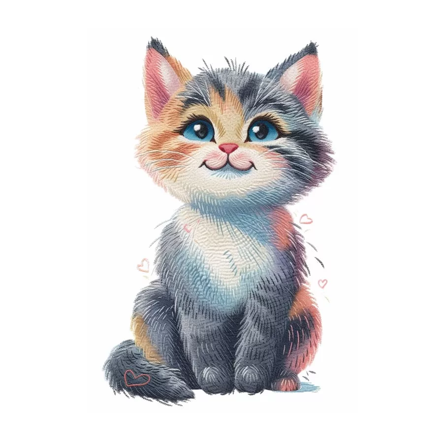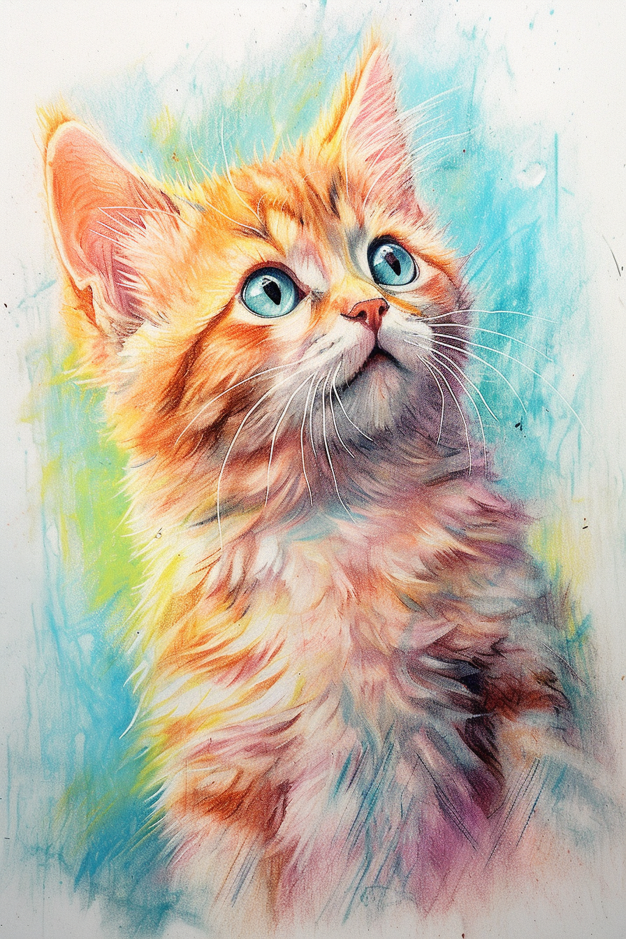 This drawing of a kitten with a big bow around its neck is perfect for playing with soft colors and textures. You can start by coloring the bow with bright tones like red or blue, highlighting the detail and adding shadow in the folds to give it more depth. The kitten can be in traditional colors like gray or beige, or you can even experiment with more creative shades like an orange kitten or with colorful spots.