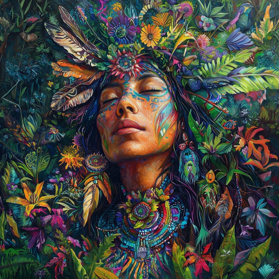 The image of Mother Earth is a powerful symbol of connection with nature. Her serene face and closed eyes evoke a state of calm and meditation, while her hair, composed of leaves, spirals, and organic patterns, reflects the diversity and balance of life on Earth. This composition invites contemplation of the unity between humanity and the natural world.