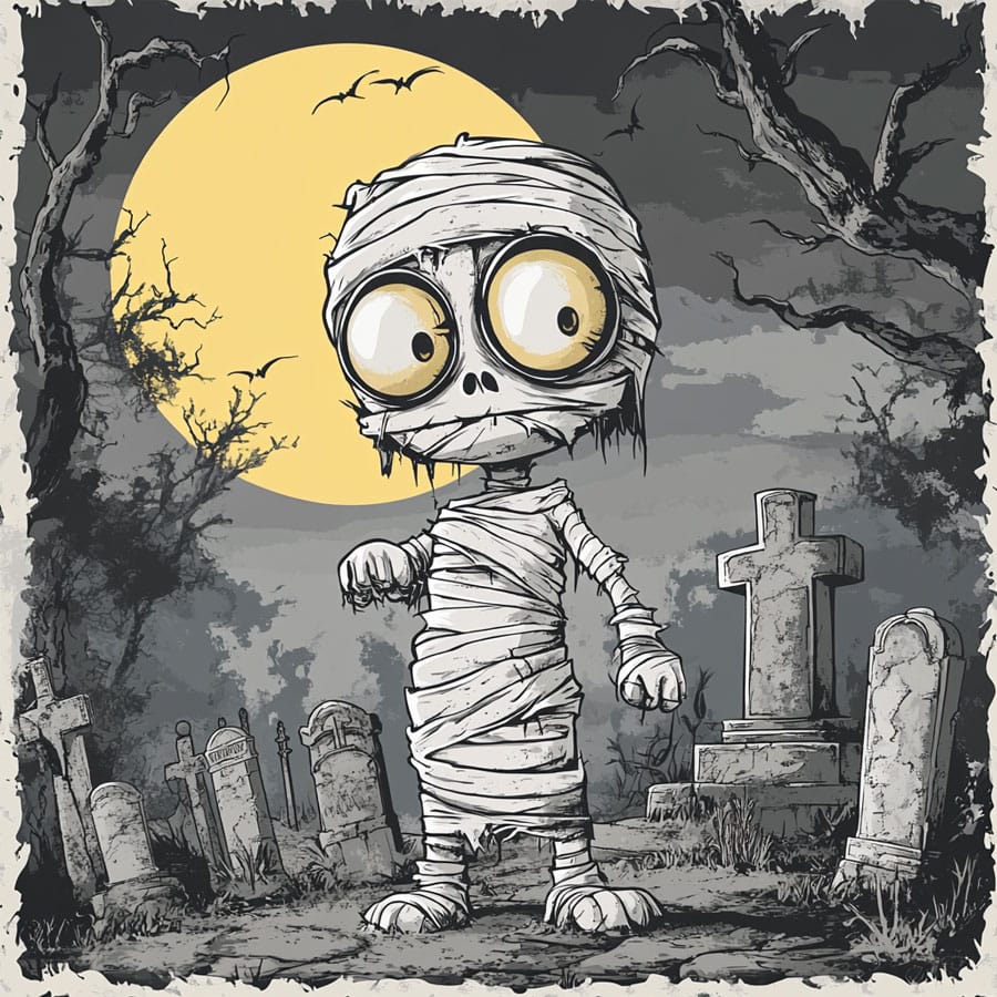 This drawing reminds us that not all Halloween characters are meant to be scary. This mummy, with its innocent gaze and carefully wrapped bandages, could be the star of a fun Halloween story. Maybe it’s on a mission to collect candy or searching for friends to enjoy the spookiest night of the year with. The mummy, a symbol of ancient Egyptian legends, transforms her into a friendly, lively character, ready to make anyone who colors it smile.