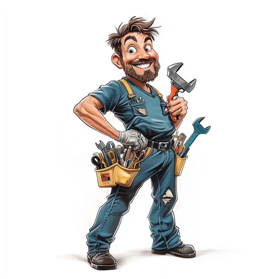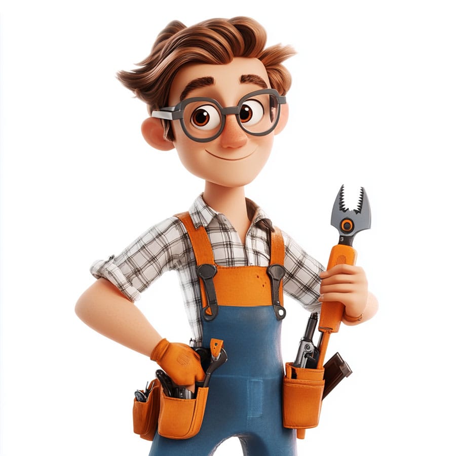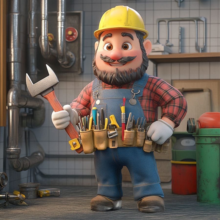 The character wears overalls with suspenders, sturdy boots, and tools on their belt. You can use colors like blue, gray, or green for the uniform, highlighting the functionality and cleanliness that characterize plumbers. The boots can be brown or black to show they’re designed to withstand tough conditions. Their smile can be emphasized with warm tones to give a friendly and trustworthy feel.