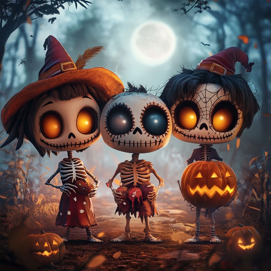 This cute scarecrow seems to be fully enjoying the Halloween season. While scarecrows are traditionally solitary figures placed in fields to scare away crows, this character seems full of life and fun. Perhaps it has just woken up to join in the Halloween festivities, sitting on its magical pumpkin and ready for a night of tricks and treats. The witch’s hat suggests that maybe it’s waiting to join a Halloween party or simply enjoying the mysterious charm of the night.