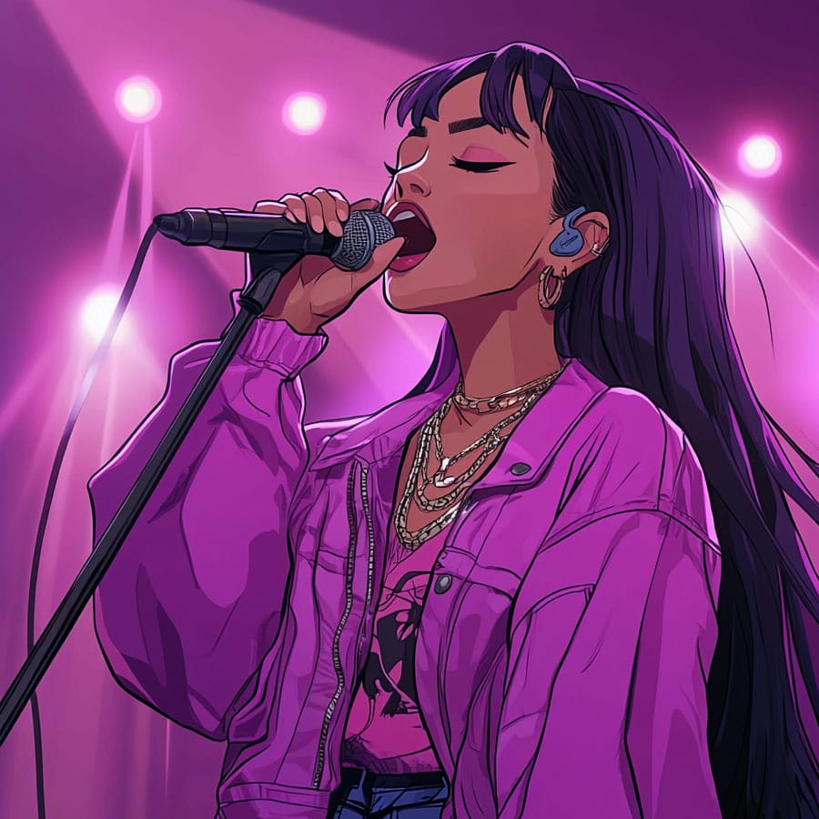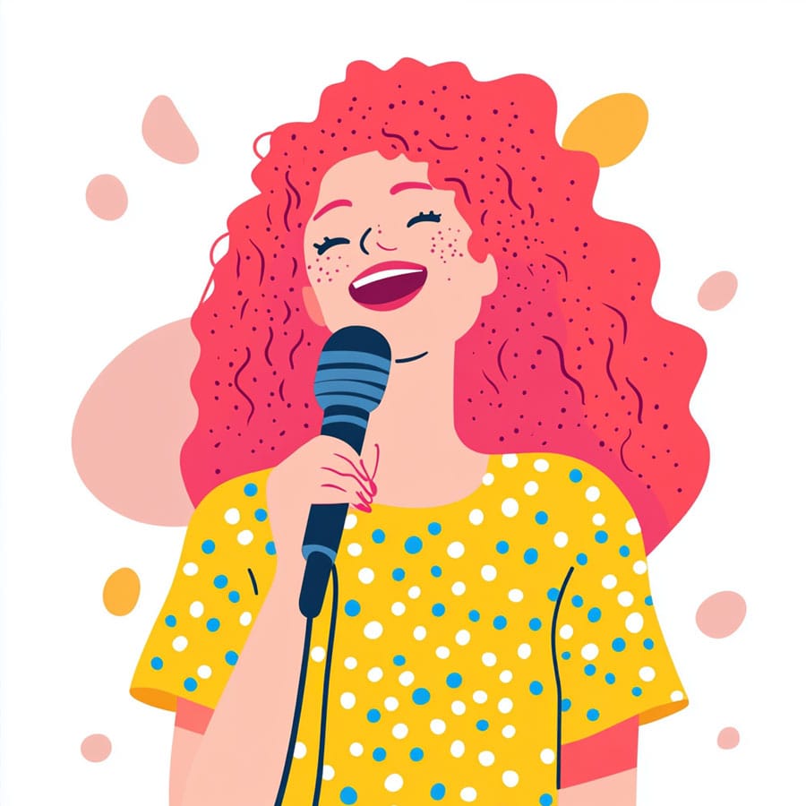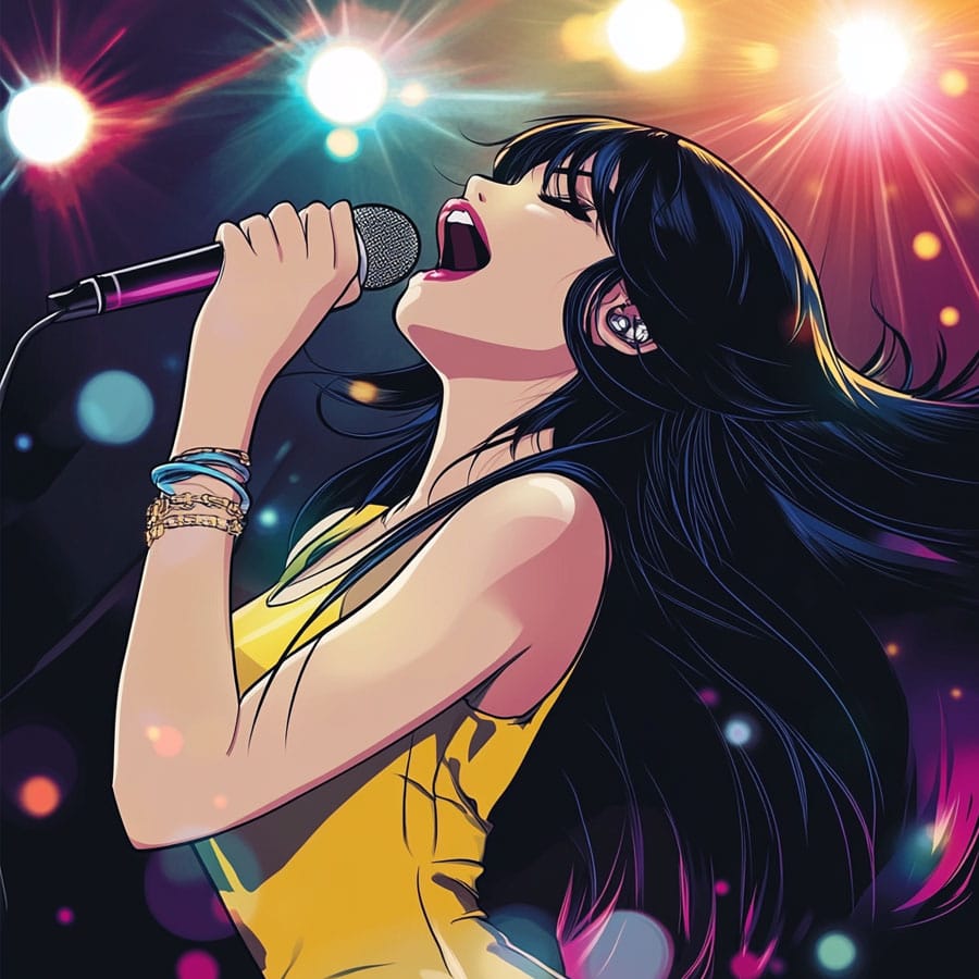 For her skin, you can pick a tone that reflects the diversity you’d like to see in real singers and add a slight pink blush on her cheeks to show the excitement of singing.