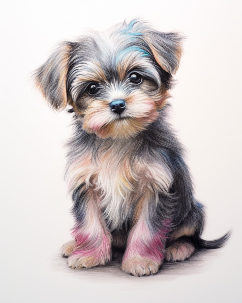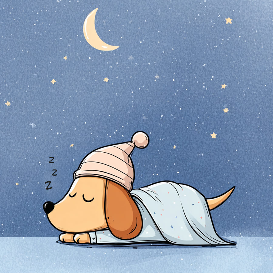 This sweet illustration shows a little dog sound asleep under a starry sky. With its striped nightcap and a blanket wrapped around it, the whole scene radiates calmness and tenderness, almost like a bedtime story frozen on paper. The crescent moon shines above while tiny stars decorate the sky, giving everything a magical and dreamy atmosphere.