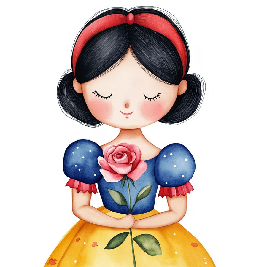 Do you remember Snow White? She’s a charming and kind princess who lives many adventures in a forest full of magic. Today, she’s right here, sitting among beautiful flowers with a bouquet in her hands. Can you imagine bringing her to life using your favorite colors?