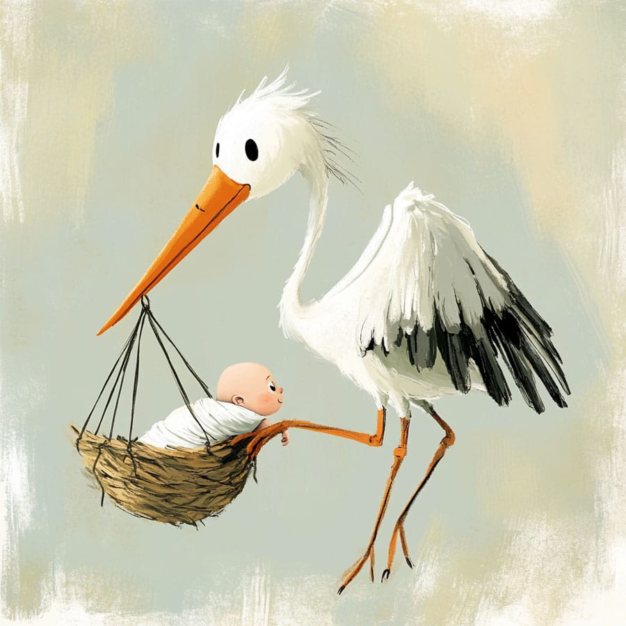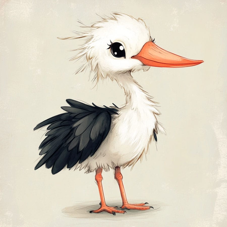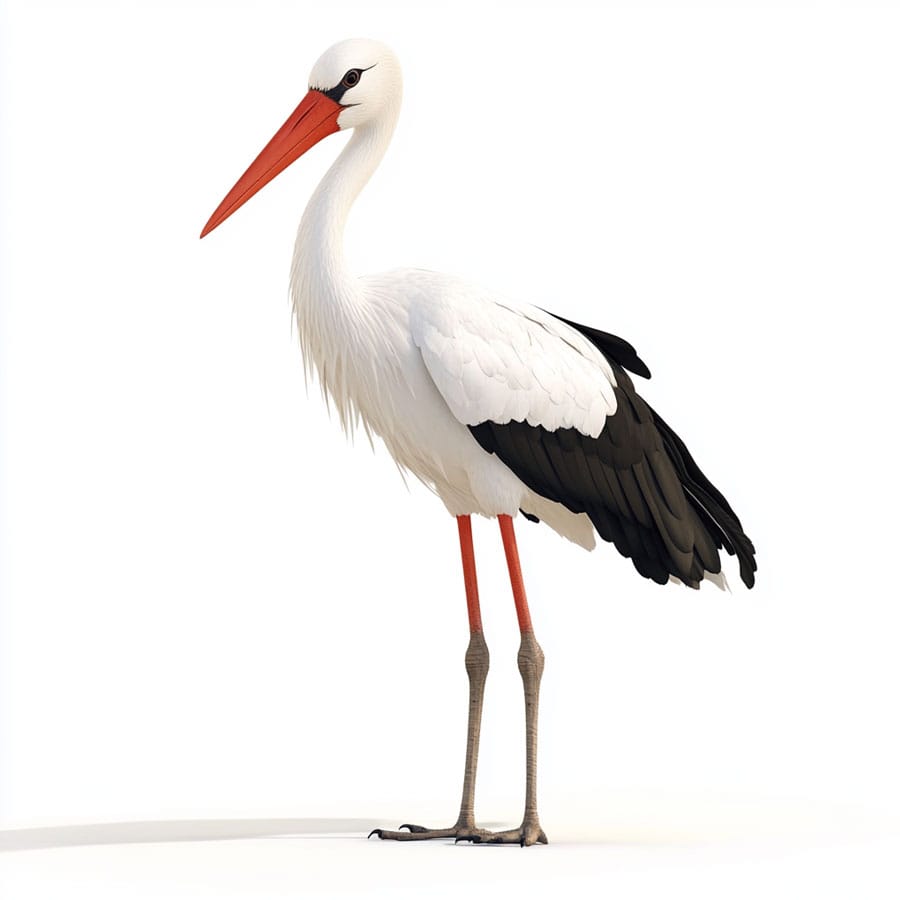 - Plumage: The stork’s body is usually white, so you can use a white or very light gray tone for a soft base. However, you can add shadows with a darker gray in areas like the neck and under the wings to give it volume and a three-dimensional look. The tips of the wings can be black, creating a nice contrast with the body.