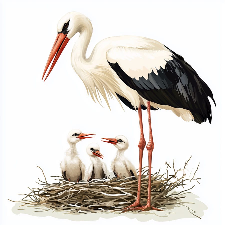- Background and Environment: Storks live near water and vegetation, so you can add green grass and a light blue tone to the ground, suggesting an aquatic or swampy environment. The background can have a soft blue sky or darker tones if you want to depict a sunset, which will highlight the stork in the foreground.