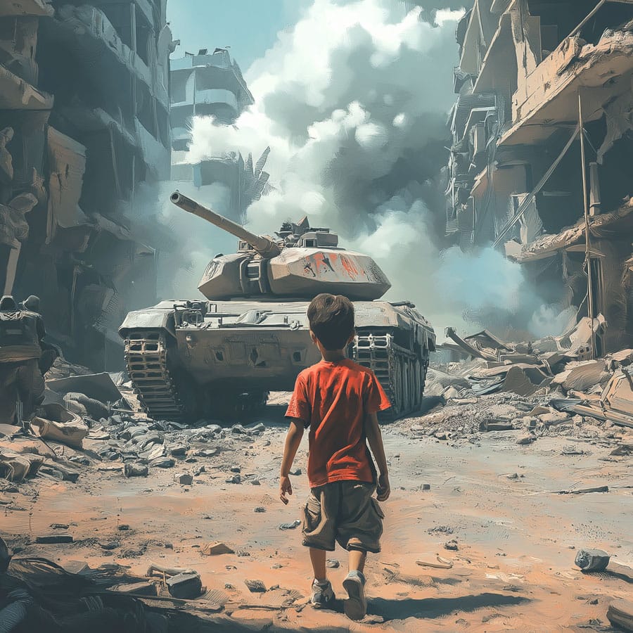 This image raises important questions: How does war affect children? What emotions arise when safety and home are taken away? What role does empathy play in emotional survival? The destruction in the landscape speaks to the devastating power of armed conflict; yet, the presence of the children at the center of the composition draws attention to human vulnerability and the hope that can endure even in the most adverse situations. Si necesitas más ayuda o ajustes, no dudes en decírmelo.