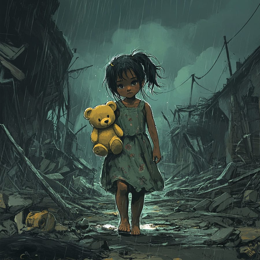 Artistically, the scene contrasts the harsh, angular lines of the destroyed buildings and the soft, rounded shapes of the children. This contrast highlights childhood innocence and fragility in a hostile and chaotic environment. Details in the rubble, such as broken stones and wood, help create a sense of devastation and abandonment.